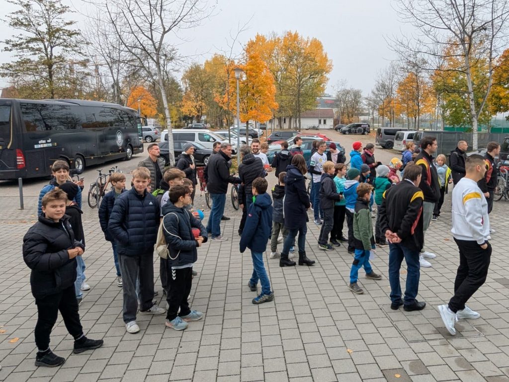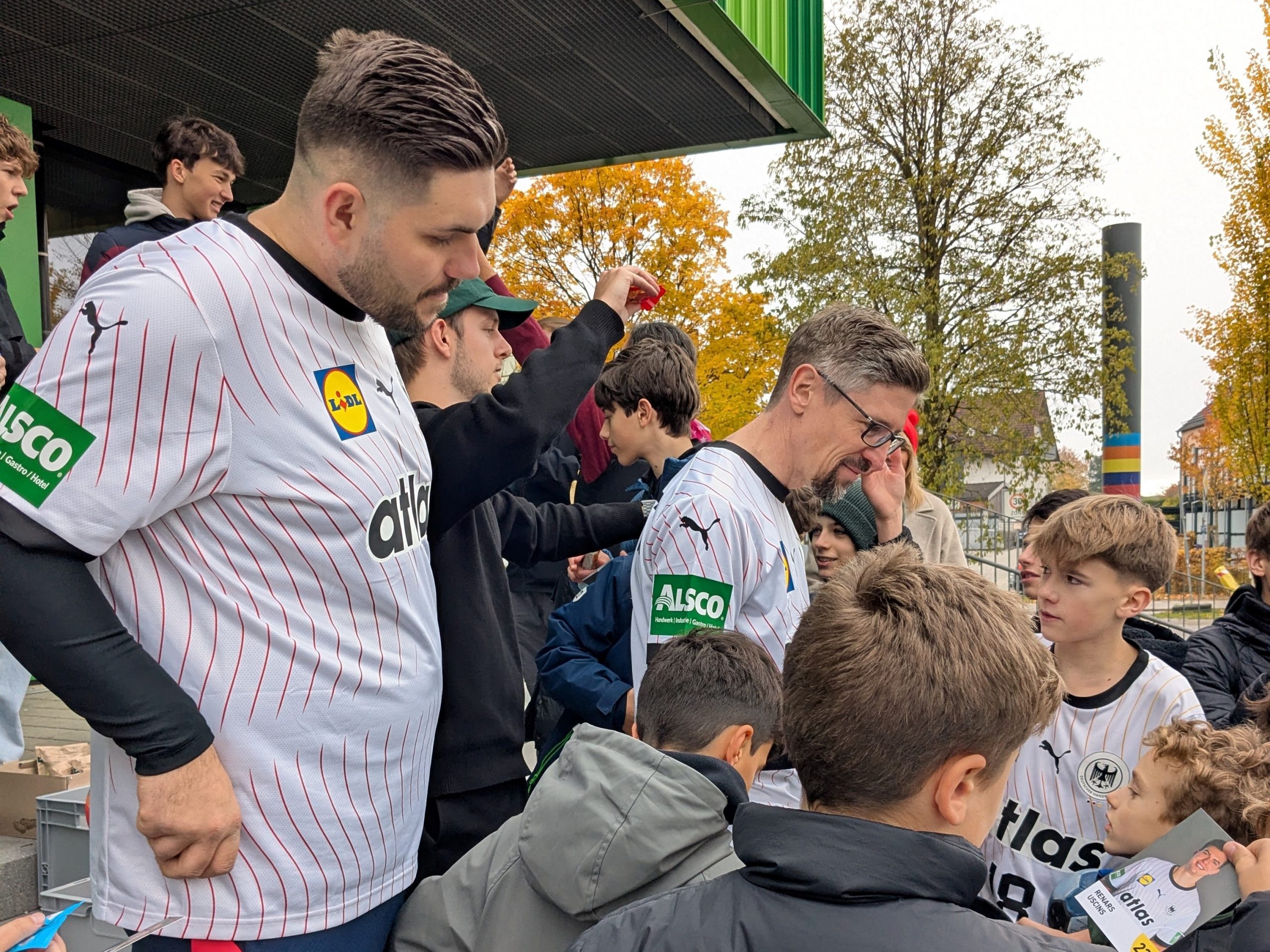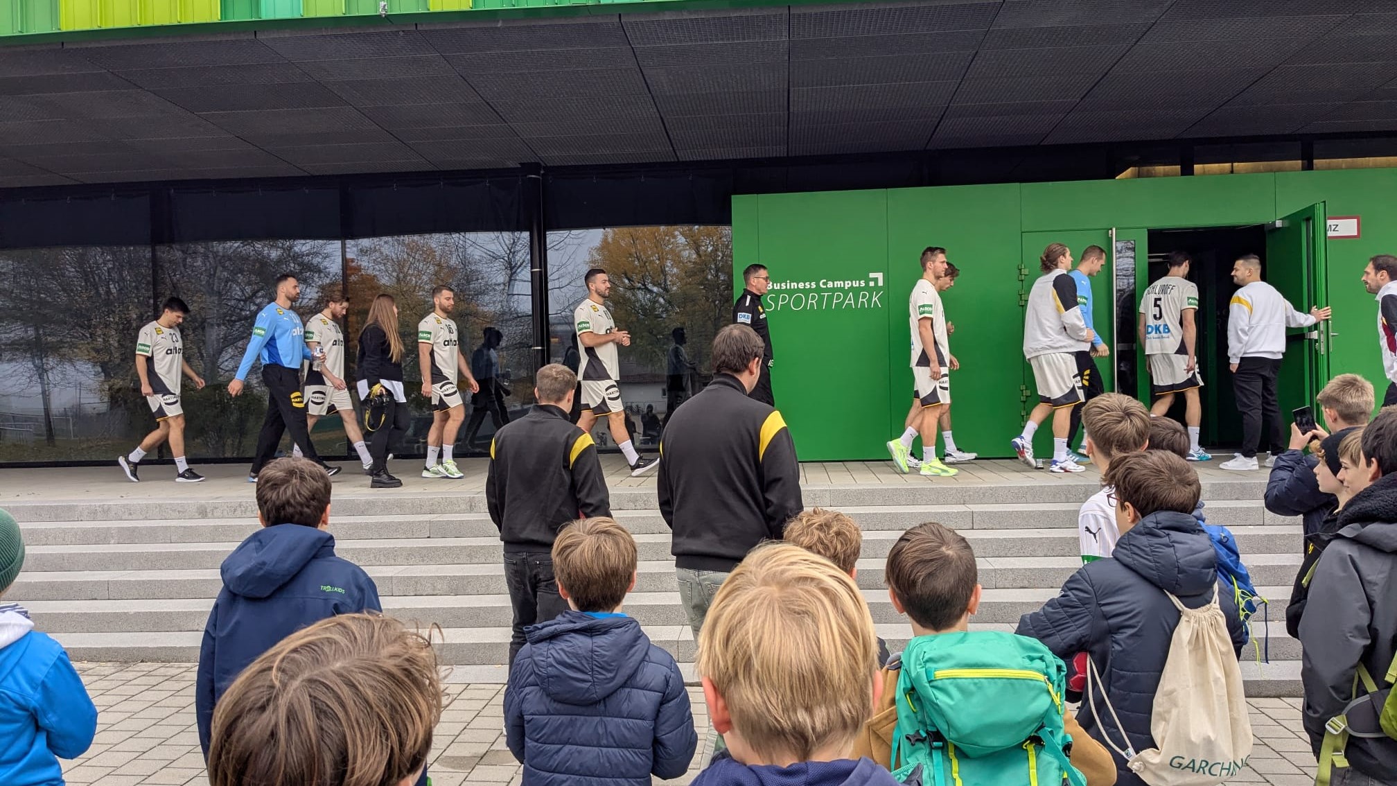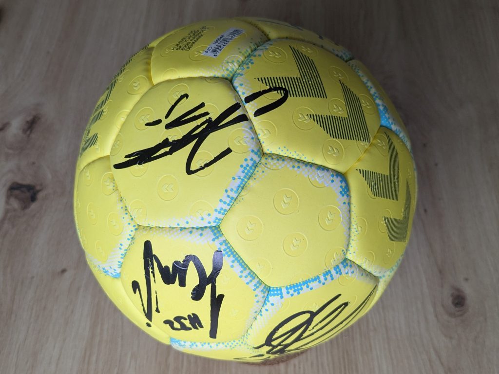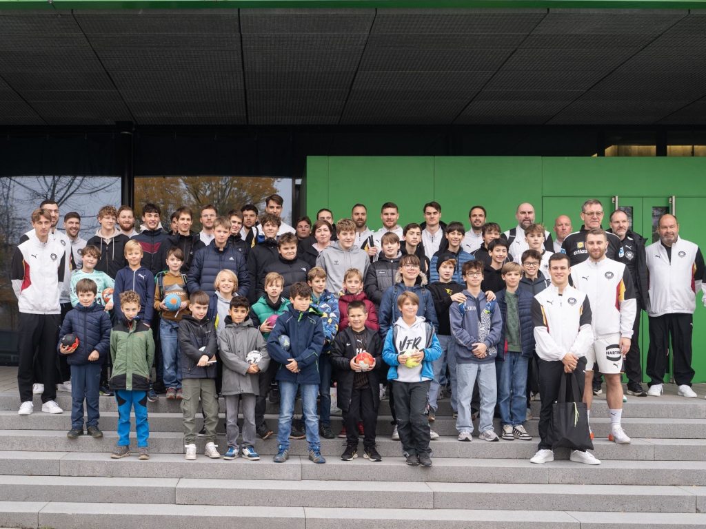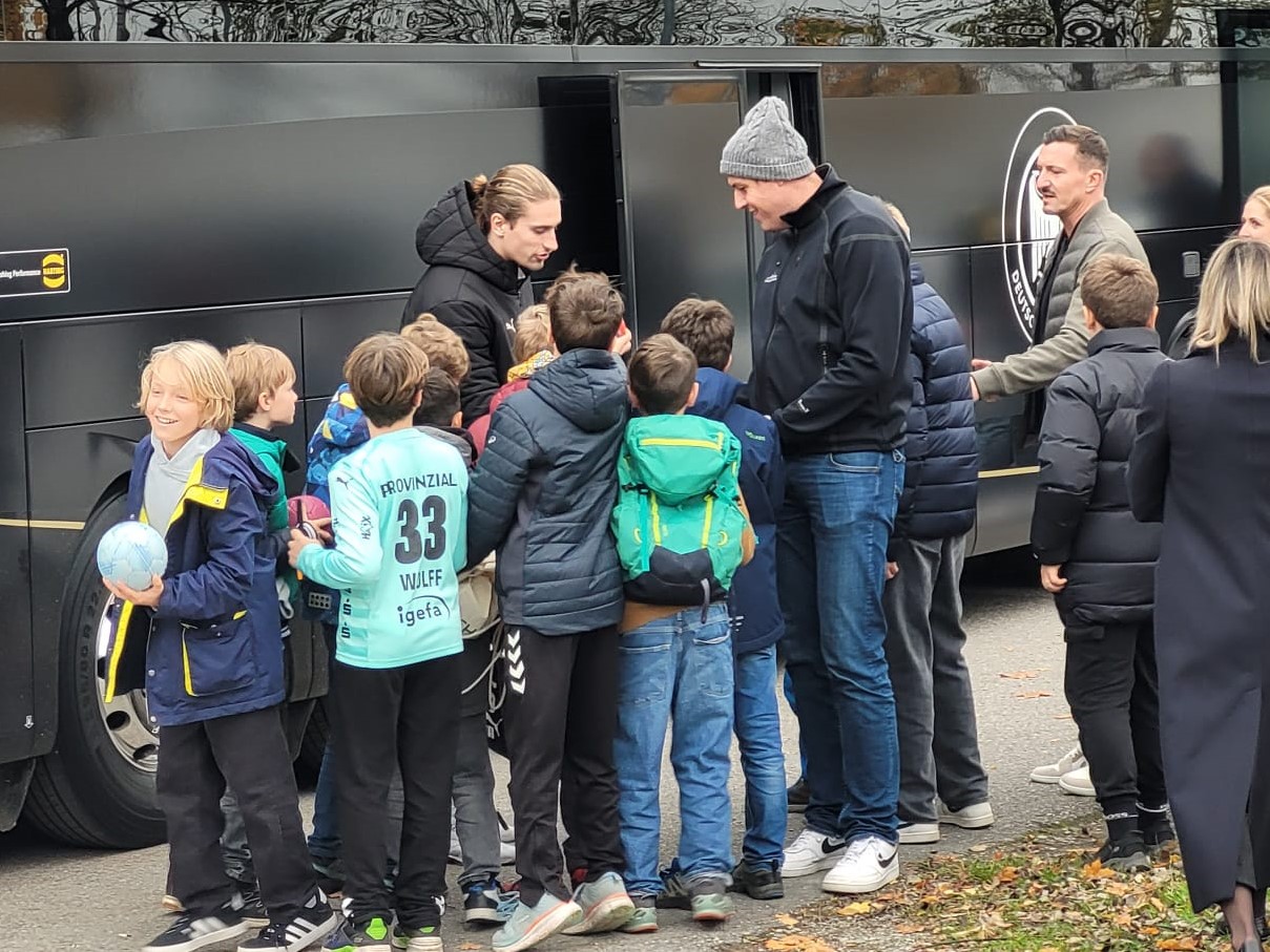 Während die Halle am Freitagmittag also sonst eher ein Ort ist, an dem sich Hase und Igel gute Nacht sagen, kamen diese Woche Wolff und Co zum Rudel. In der Hoffnung auf ein paar schöne Bilder, wurde hierfür im Vorfeld um die Unterstützung der Schulen gebeten, doch bitte den Kindern für dieses Erlebnis frei zu geben. Womit wir nicht gerechnet hatten war, dass die Unterstützung so groß war und sich derart viele Eltern anschlossen, dass es darüber beinahe zu, Krach mit dem DHB kam. Die Truppe hatte natürlich einen engen Zeitplan und befürchtete, in einer Traube aus Fans stecken zu bleiben. Unser kurzfristiger Aufruf an die Elternschaft, doch bitte zu Hause zu bleiben, verpuffte wie ein Eiswürfel auf der Sonne. Dennoch durfte der Nachwuchs für ein gemeinsames Foto posieren und ein paar Kinder schafften es auch, ihren Ball signieren zu lassen, bevor wir von offizieller Seite einen Haufen Autogrammkarten erhielten. Jugendleiter Michael wurde daraufhin beim Verteilen belagert, als wäre er selbst der Star an diesem Tag, sodass sich der ebenfalls anwesende Dominik kurz Klein machen und vorbei schlüpfen konnte, bevor als letztes Mannschaftsmitglied David leicht verSpäthet ebenfalls die Gunst der Stunde nutzte. Wirklich Knorrke, dass hier so lieb an den Autor gedacht wurde, die Witzke schreiben sich wie von selbst.